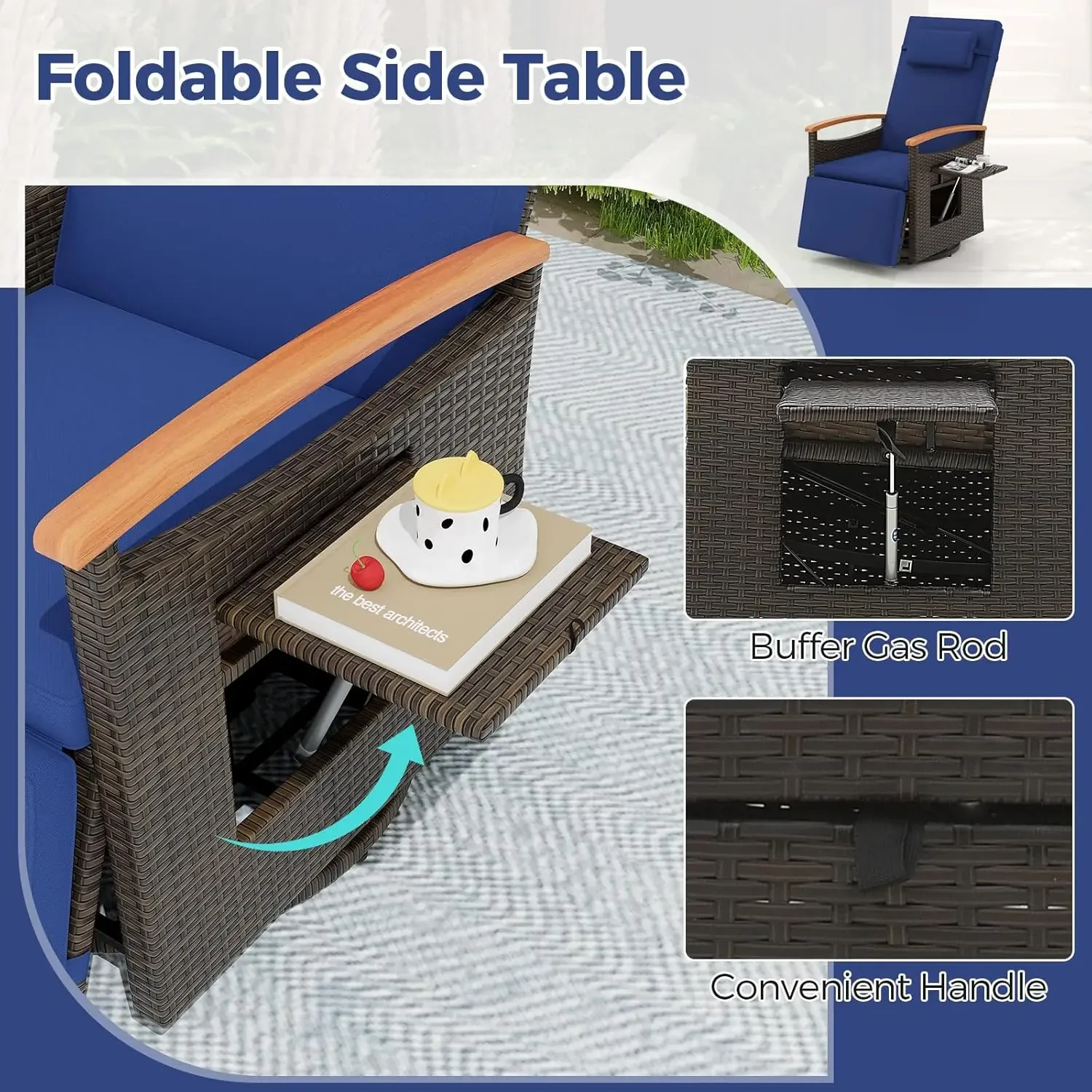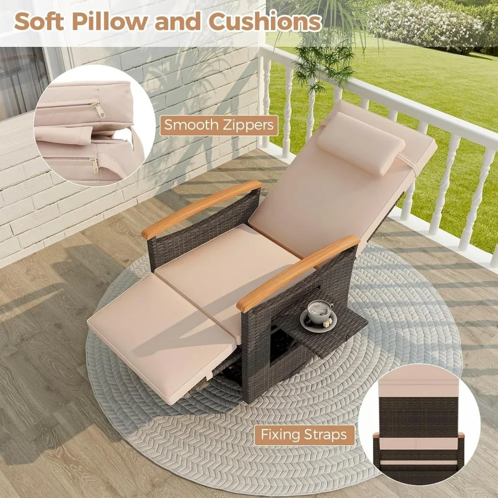 - Convenient Side Table: The wicker lounge chair is designed with a foldable side table supported by a premium gas rod. The side table is perfect for placing your drinks, books, or sunscreen as you recline in comfort.