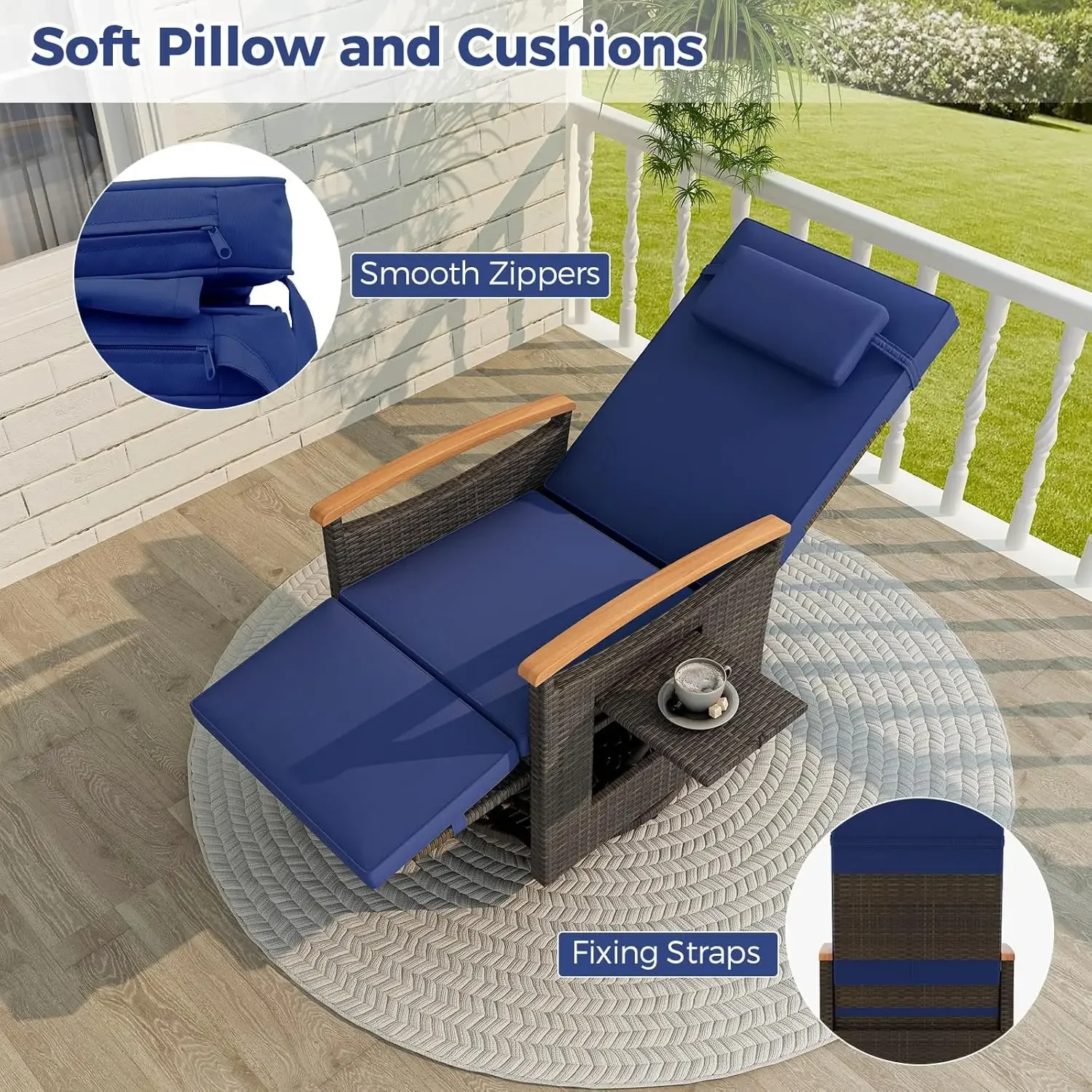 - Cozily Cushioned Design: Fitted with soft pillow and cushions, this patio reclining chair ensures maximum coziness. The cushion covers, secured by straps and hook and loop fasteners, have zippers for easy removal and washing.